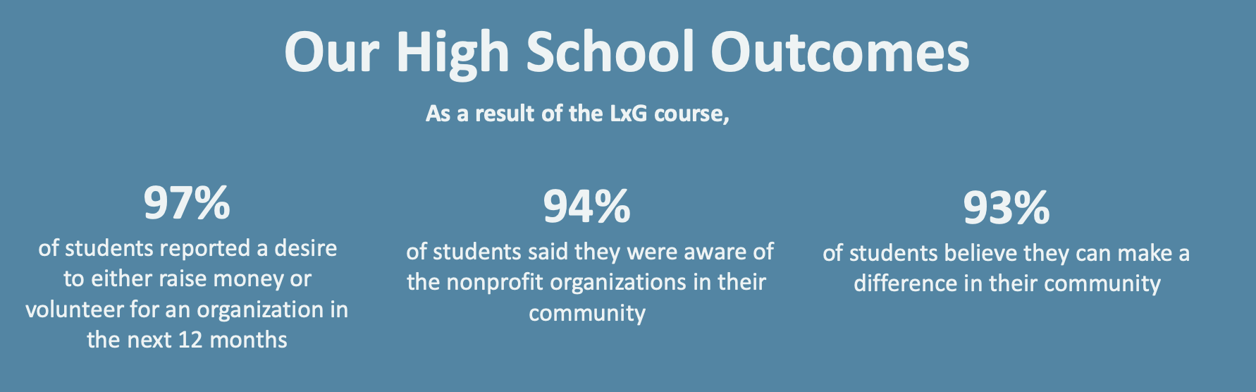 In 2018, Learning by Giving (LxG) launched its first youth philanthropy program in order to inspire and educate a new generation of philanthropists and community leaders at the high school level. LxG intends to build the field of youth philanthropy by collaborating with high school partners that have diverse student populations and high concentrations of students who will become first generation college students with the goal of democratizing who gets experiential philanthropy education.
